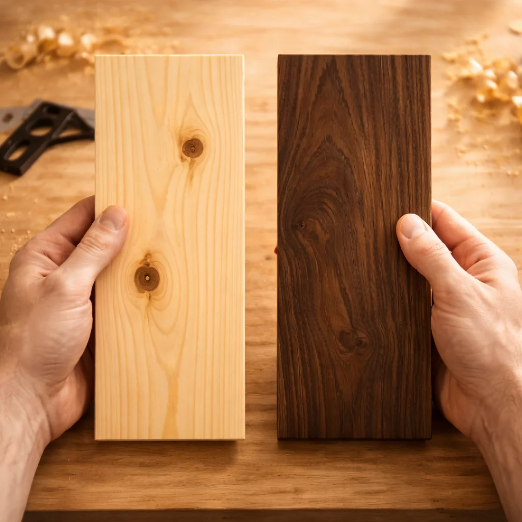 Hardwood comes from deciduous trees like oak and walnut. It’s denser, more durable, and more expensive. Softwood comes from coniferous trees like pine and cedar. It’s lighter, easier to work with, and more affordable. Both have their place — the right choice depends on your project and budget.