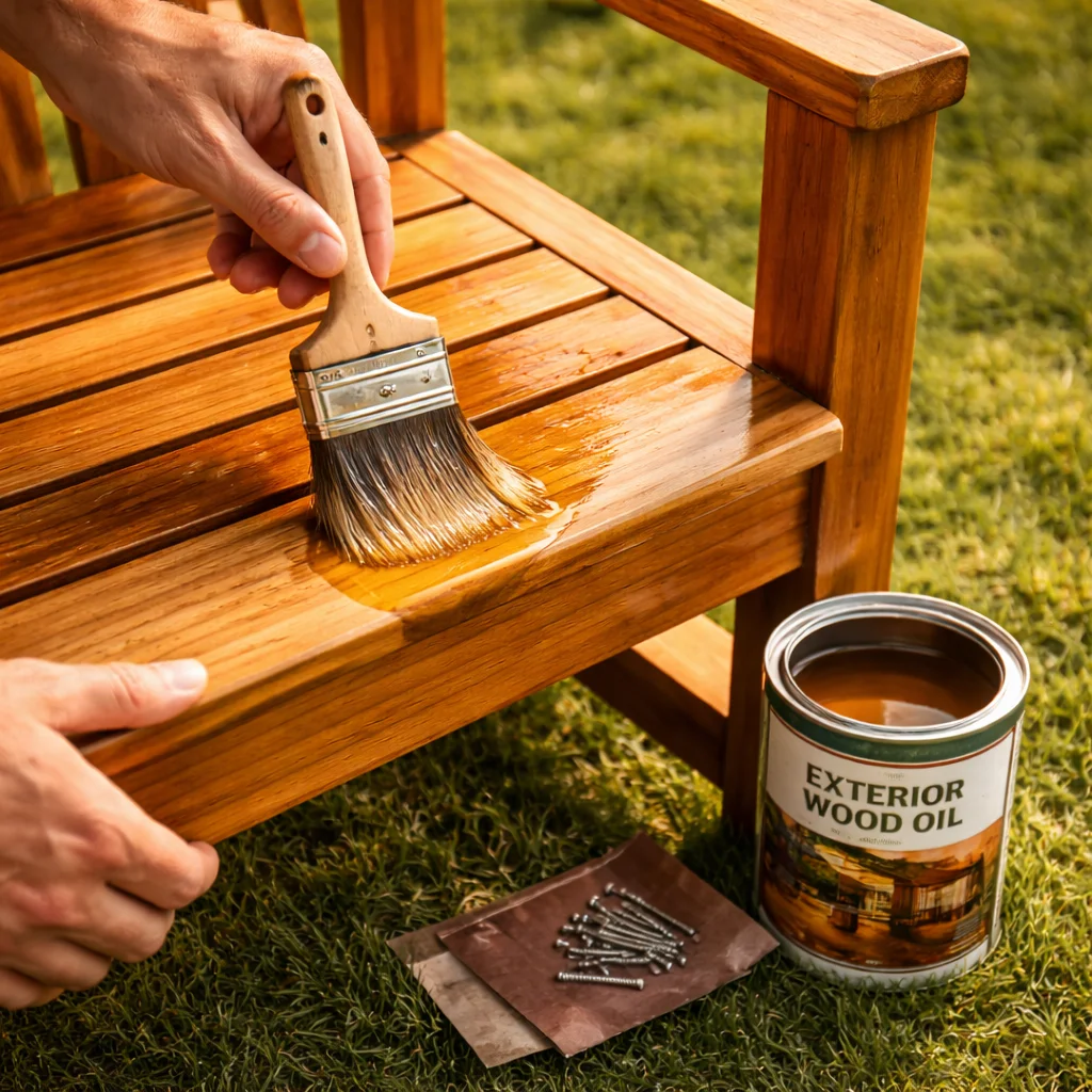 Use cedar for its natural rot resistance. Space the seat slats 8–10mm apart to allow rainwater to drain freely. Finish with a penetrating exterior oil to protect the surface and enhance the natural grain.